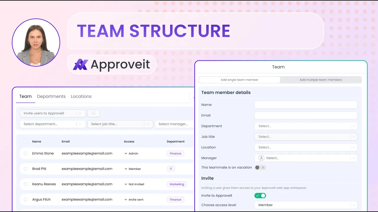 To manually add a new team member in Approveit, click the + New Team Member button and enter all the necessary information. Afterward, to assign organizational structure parameters such as department, location, and job title, navigate to the Team section, start typing to add a new Department, Location, or Job Title.